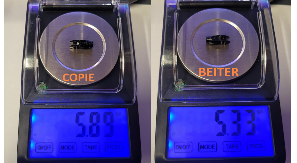 – Sur la contrefaçon, la cheminée d’injection du plastique est plus haute et seulement d’un seul coté
